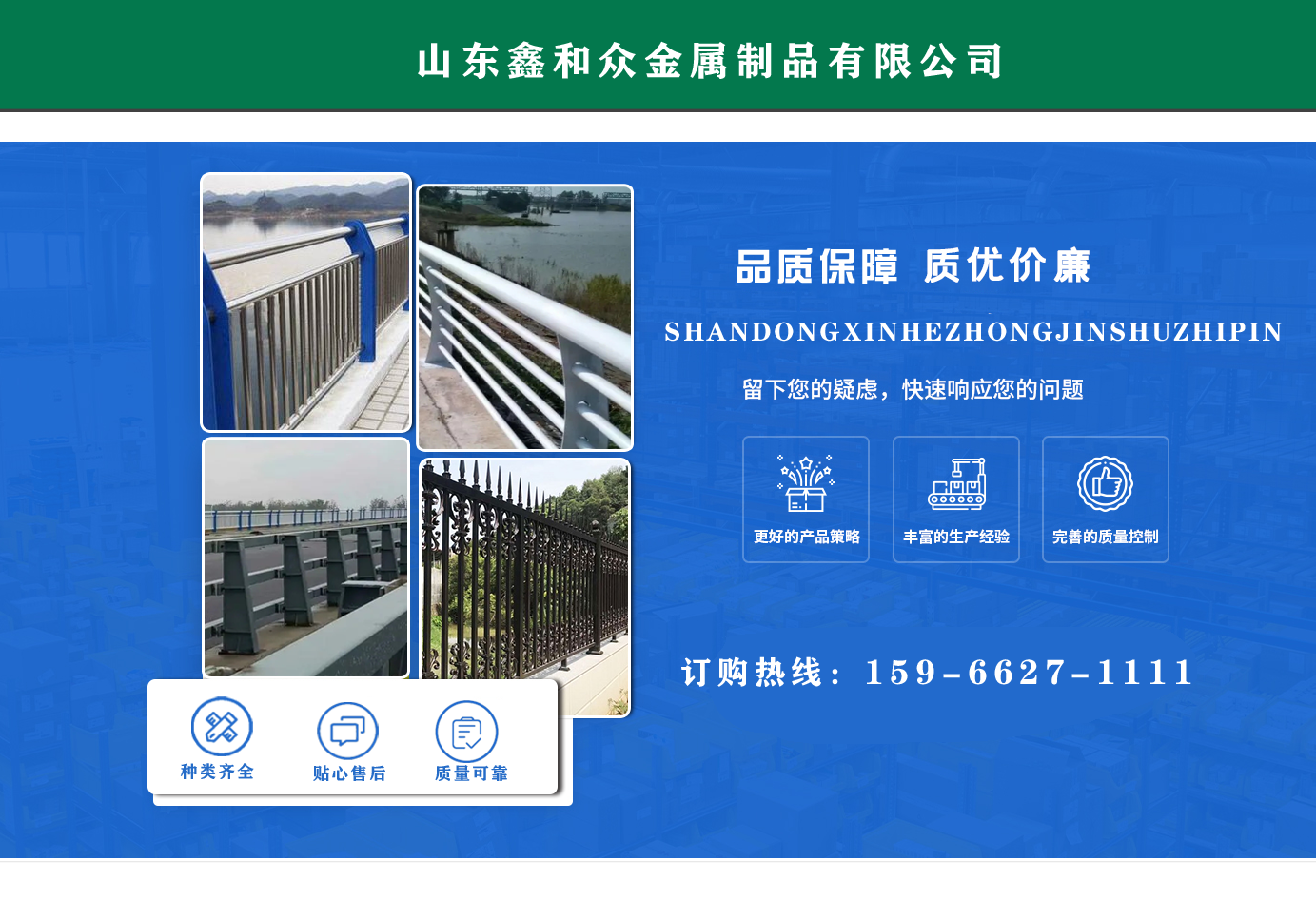 山東鑫和眾金屬制品有限公司主要產(chǎn)品有防撞護(hù)欄,橋梁護(hù)欄,道路護(hù)欄,河道護(hù)欄,不銹鋼護(hù)欄等護(hù)欄。提供設(shè)計(jì)方案,一站式定制,包您滿(mǎn)意價(jià)格優(yōu)惠,歡迎來(lái)電咨詢(xún)! 公司常年從事銷(xiāo)售護(hù)欄防撞護(hù)欄,橋梁護(hù)欄,道路護(hù)欄,河道護(hù)欄,不銹鋼護(hù)欄,橋梁鋼護(hù)欄,河道燈光護(hù)欄等。產(chǎn)品廣泛應(yīng)用于橋梁、河道、旅游景區(qū)、道路、公路、公園、小區(qū)、景觀、道路防撞等領(lǐng)域?! 」井a(chǎn)品均采用優(yōu)質(zhì)不銹鋼材料,符合相關(guān)標(biāo)準(zhǔn)。各種型號(hào)不銹鋼復(fù)合管及護(hù)欄,質(zhì)量嚴(yán)格把控。產(chǎn)品強(qiáng)度高、耐腐蝕、焊接牢固、抗沖擊、性能好,防撞護(hù)欄結(jié)構(gòu)簡(jiǎn)單、美觀實(shí)用大方?! g迎前來(lái)訂購(gòu)!...